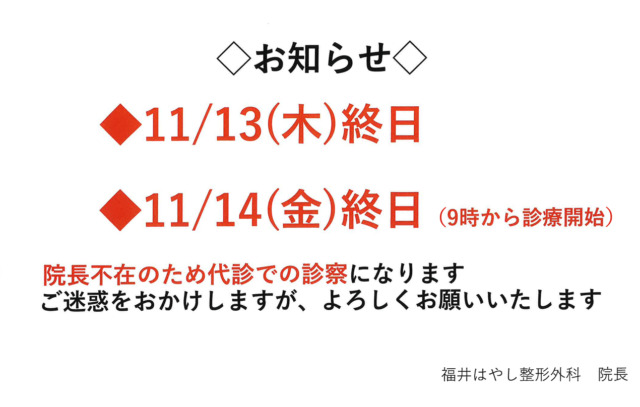 院長不在のため代診での診察になります。ご迷惑をおかけしますが、よろしくお願いいたします。